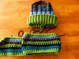 Okay, I moved backward on Aaron’s scarf, froggin‘ the whole damn thing. I redeemed myself, though, finishing it…in a different style. I ended up crocheting it. It went a whole lot faster, giving me the extra time to work on his hat!