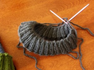As you can see, I’m not totally finished. I still have to weave in ends and start on mittens BUT before I do that, I’m starting on Sean’s hat. This is what it looks like now: