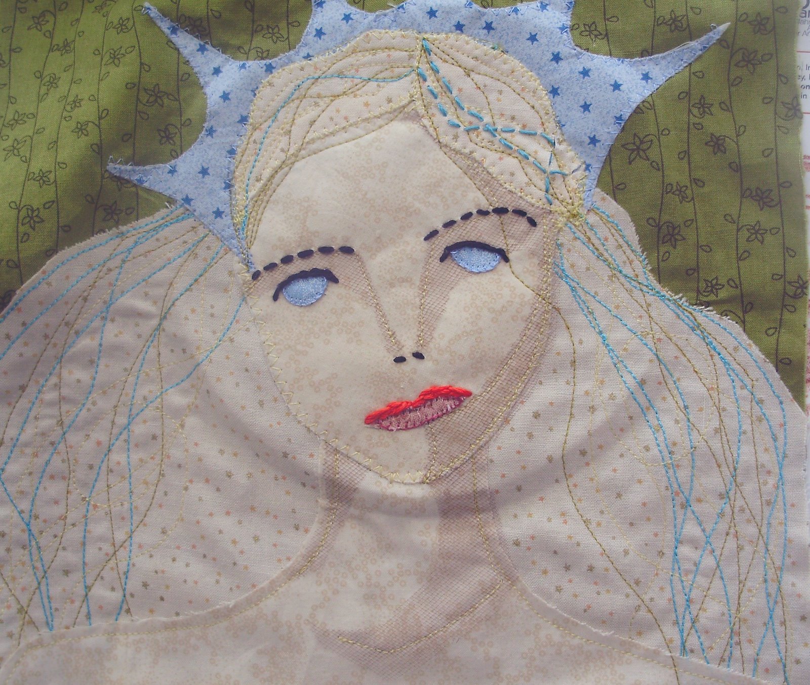 The first thing I should do–iron. She looks like she has a noose around her neck. (Just a crease left by the embroidery hoop.)