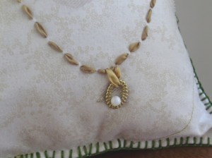 The necklace is made of golden silk ribbon, moonstone, and gold-toned metal.