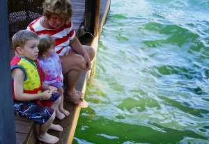 Kate has a lot of carp living under her dock. Here, she fed the fish with Aaron and Maggie.