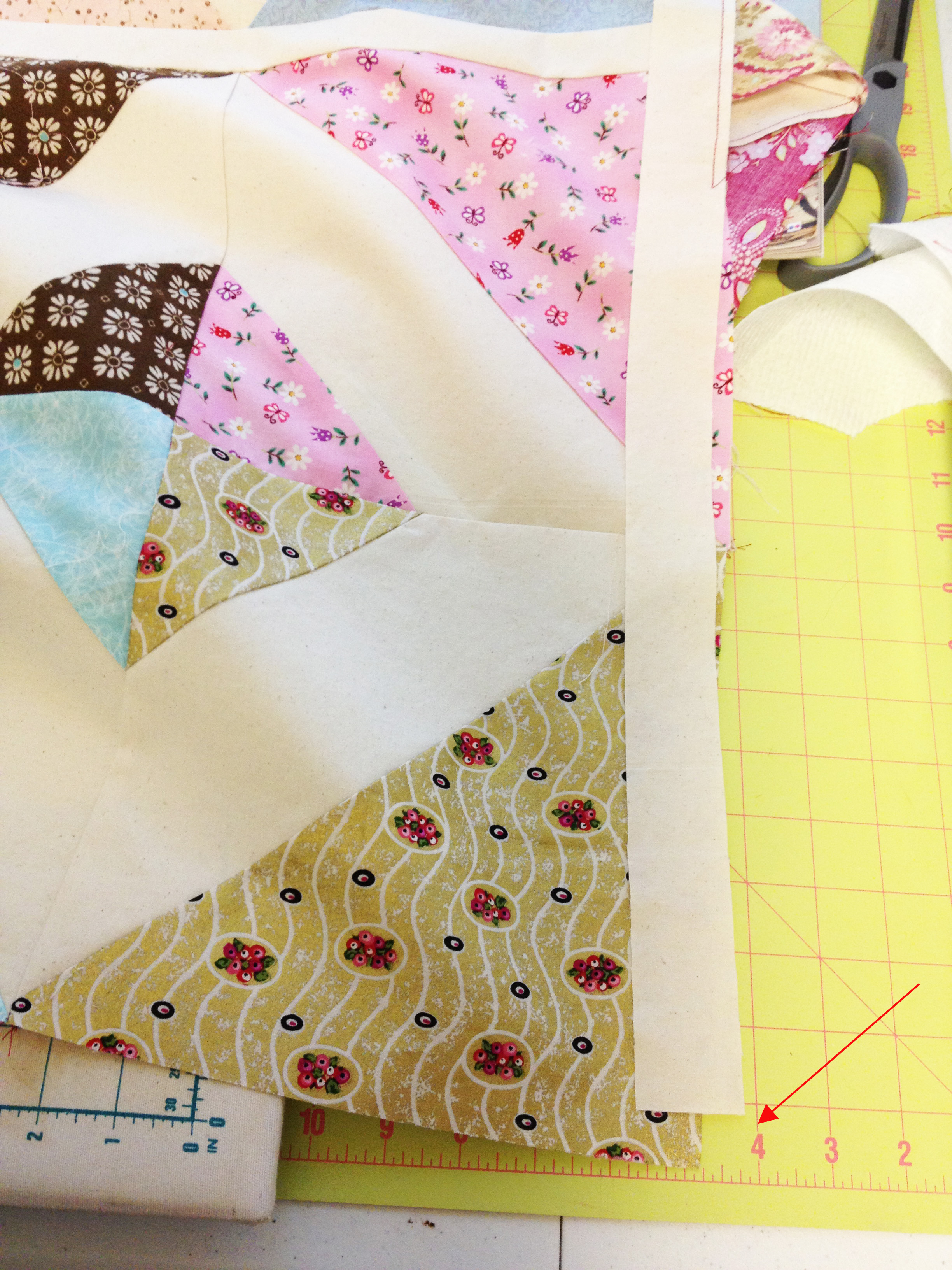 So, this seemed to be the pattern as I finished up the sashes–every sash seemed to be a smidgen too small. Then I realized my mistake. My seam allowances were all off by one to two millimeters. Sigh. (I blame baby-brain.)
