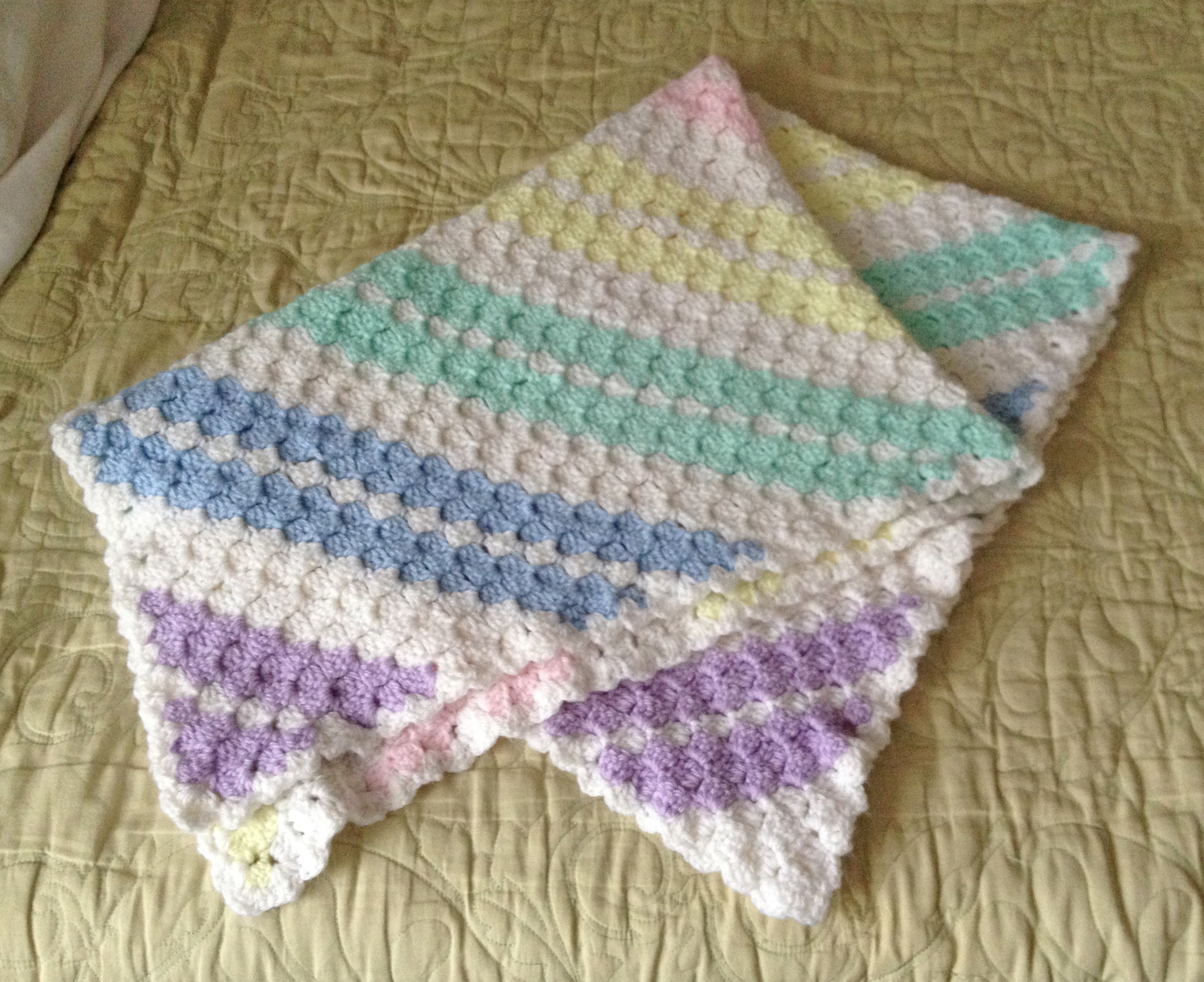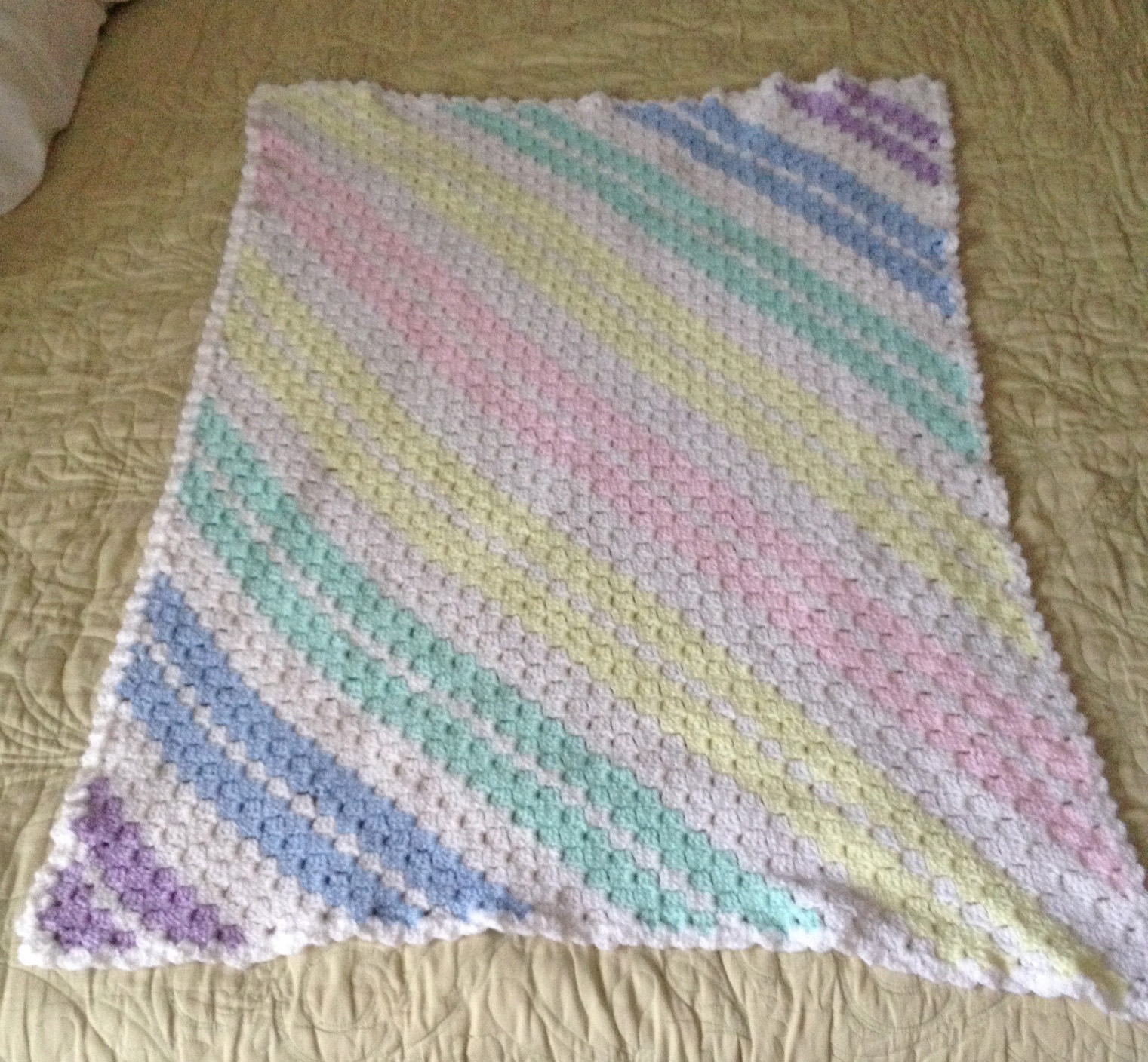 First, the finished project. This a baby blanket I’ve been crocheting over the summer. That pattern is Soft Snuggles Baby Blanket from the book Colorful Cuddlers. It was a fairly easy pattern, and, although I’m not a huge fan of pastels, I ended up liking how the blanket turned out.