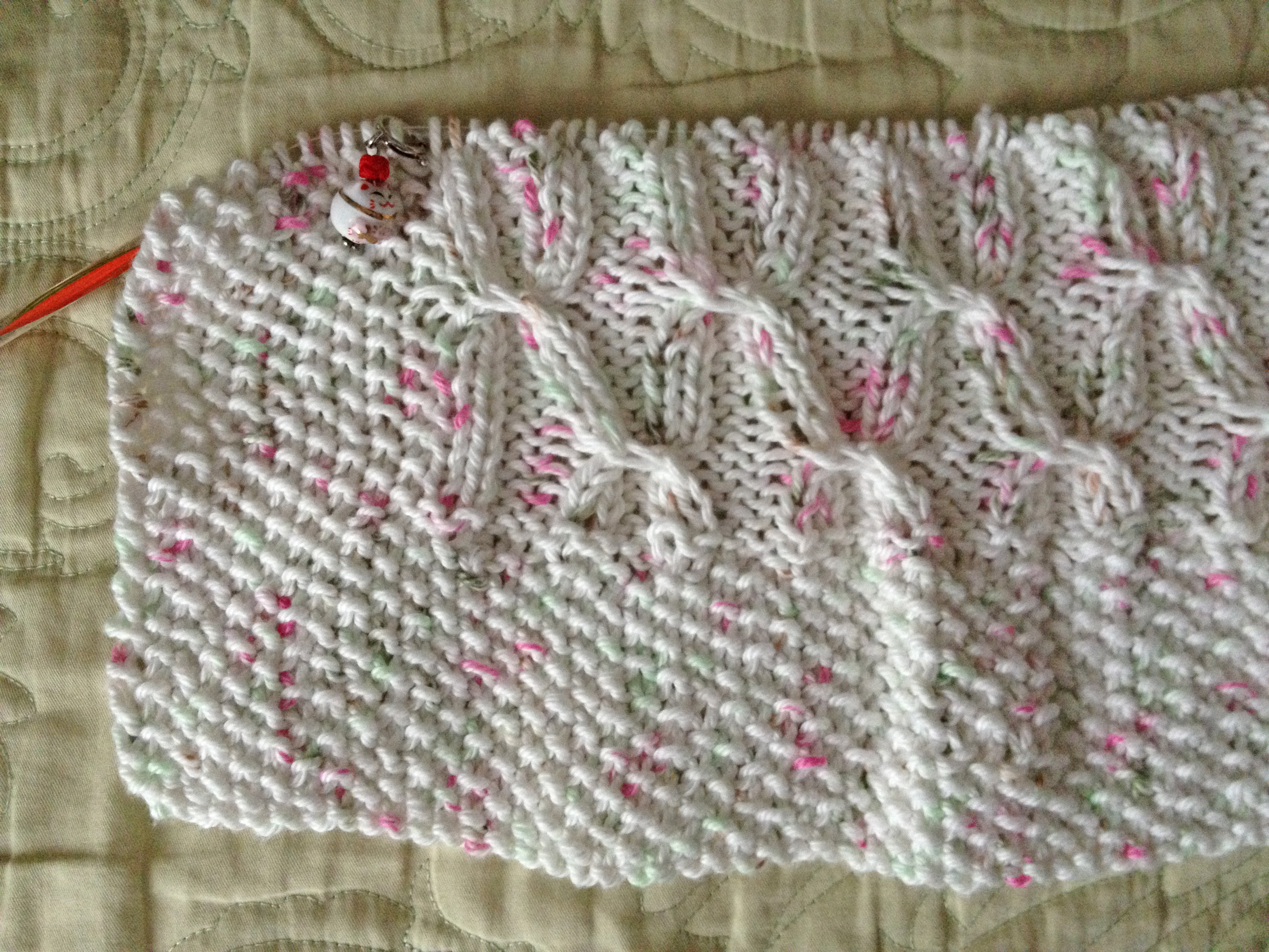 Now, I’m working on another baby blanket. This one is knitted, and, so far, I’m loving the pattern. The pattern is Sugarplums Blanket, and can be found on Ravelry.