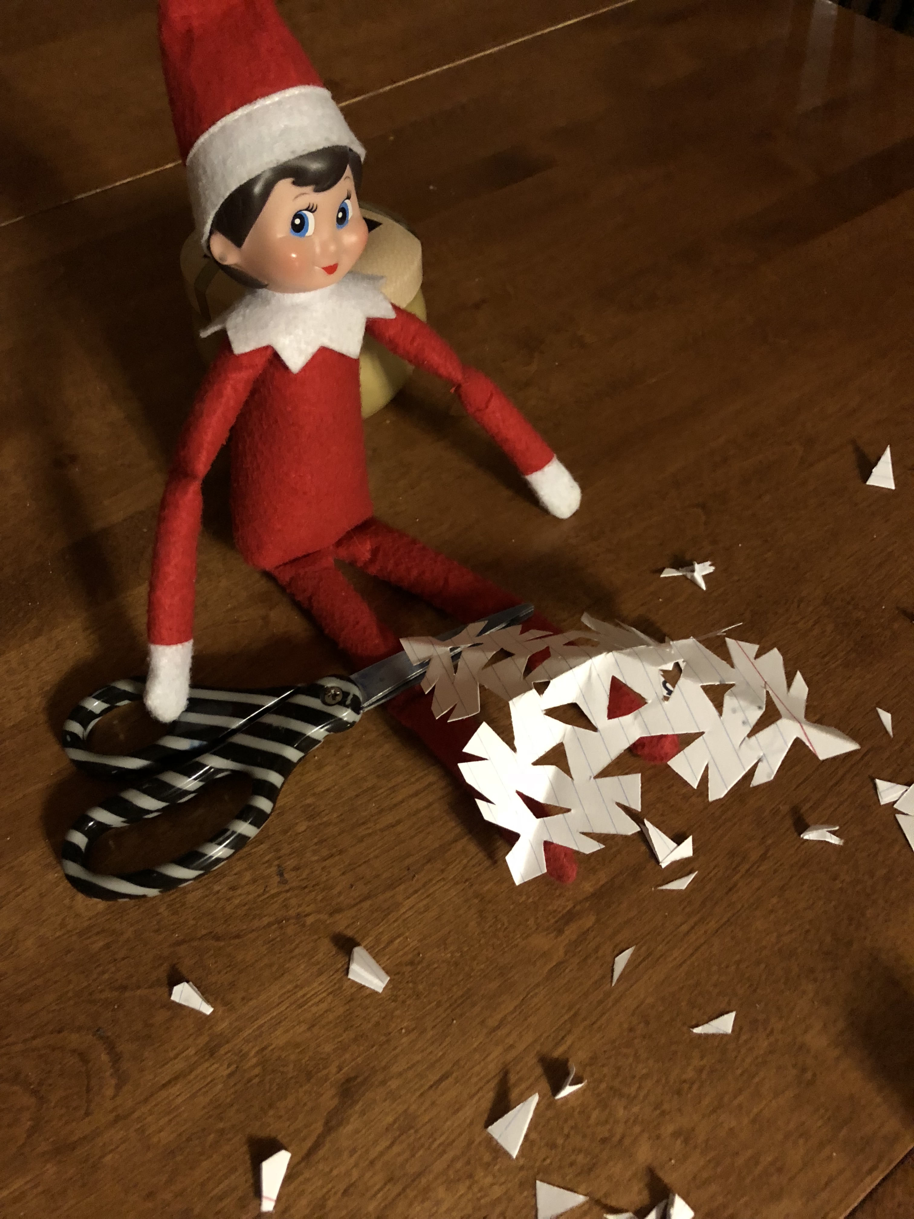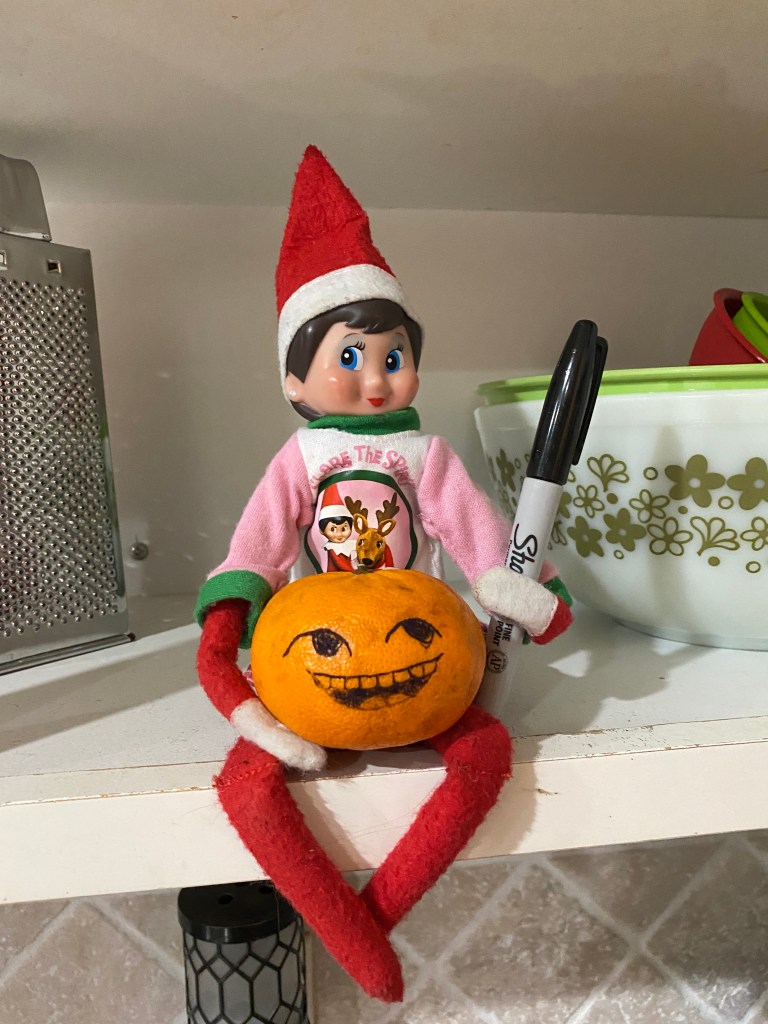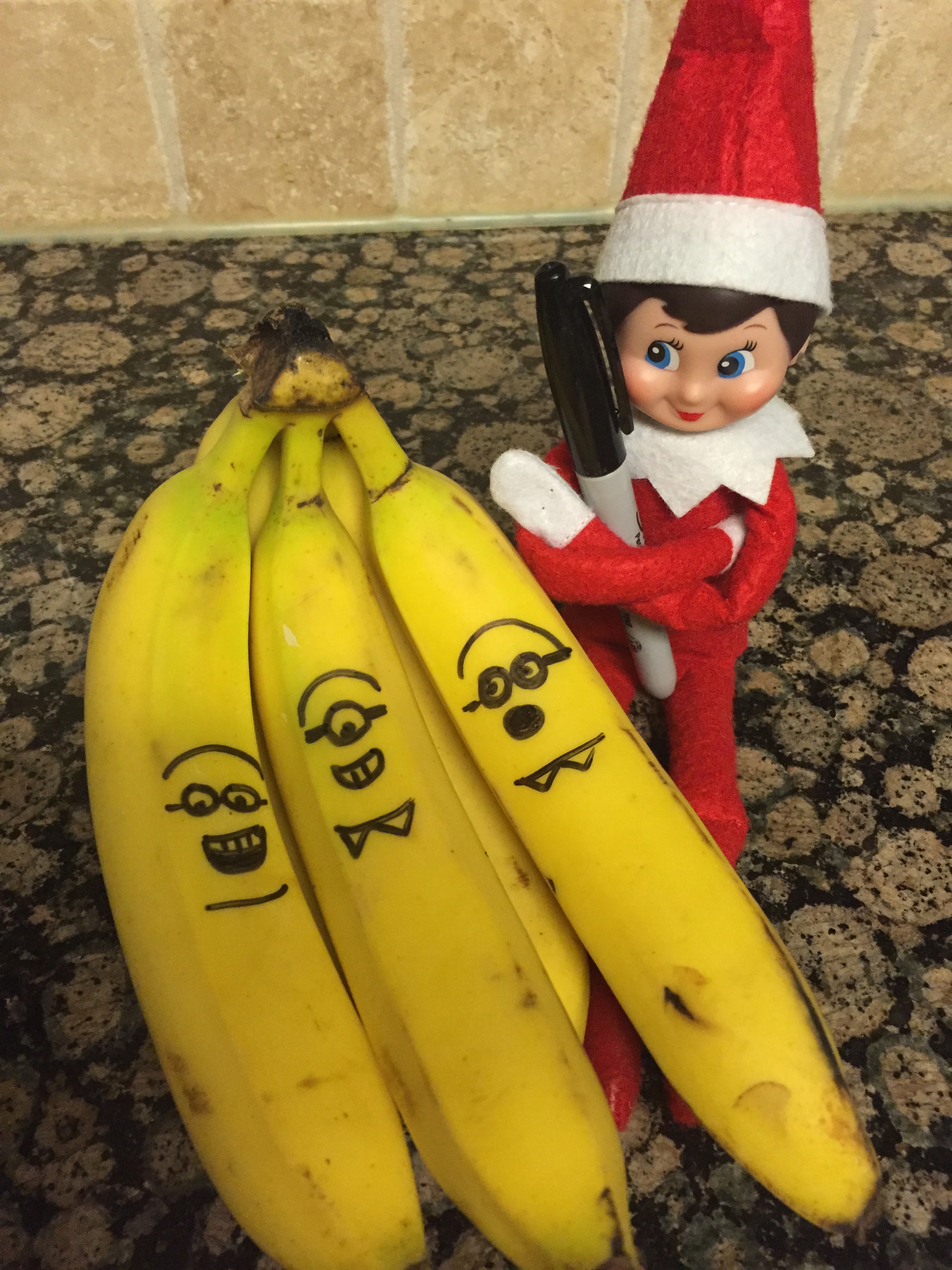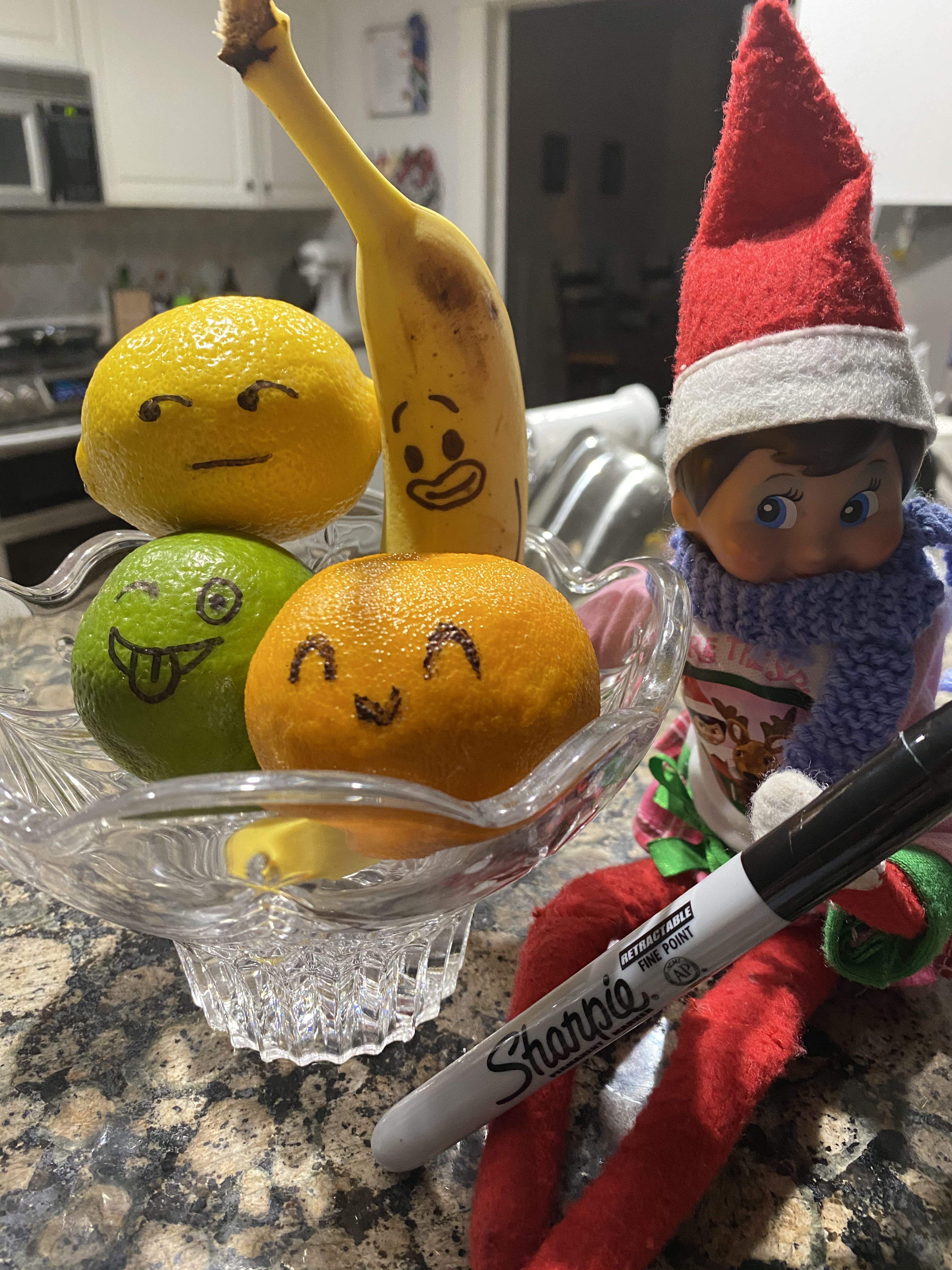 Okay…As you have seen, there will be repeats…you can keep it fresh, though, by putting a slight twist on tired old gently used ideas. For example, maybe your elf is decorating oranges instead of bananas? Maybe she, he, or they are drawing snowflakes on the glass windows with chalk marker? Just have fun with it.