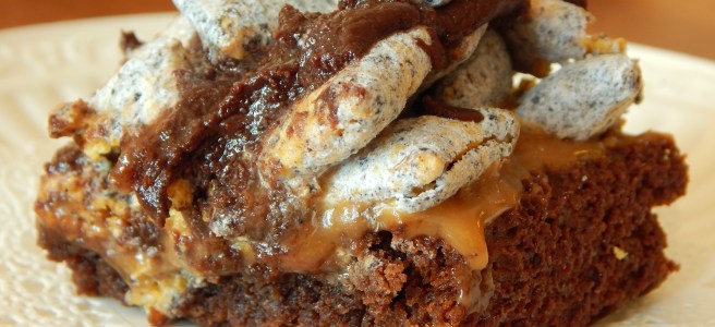 Rich, decadent brownies that combine chocolate, caramel and "puppy chow," otherwise known as "Muddy Buddies."